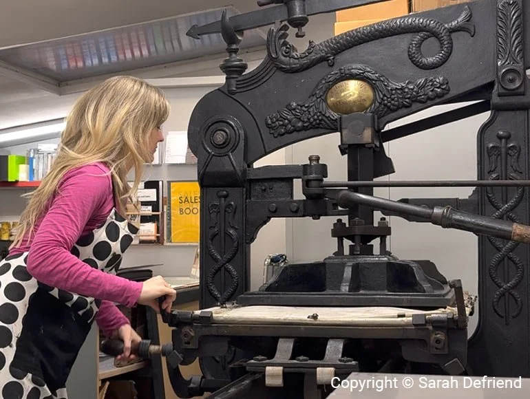 Once I’m happy with the carving, I apply Cranfield ink to the vinyl block, then carefully lay the paper on top. To transfer the image, I either hand burnish the surface using a baren or use a press, I often use this stunning 1853 Columbian Relief Press at the Swansea Print Workshop.