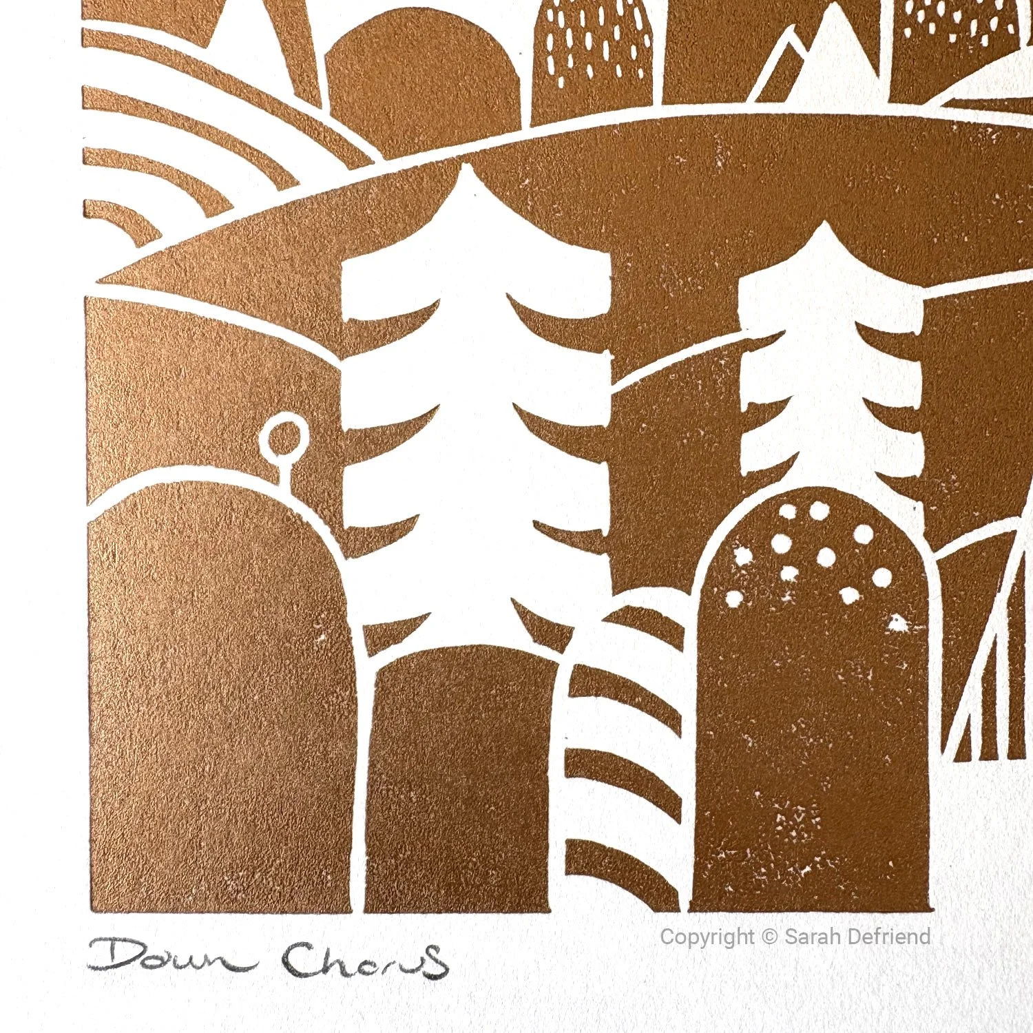 Metallic bronze and bright orange Lino Print specially created for Seed House