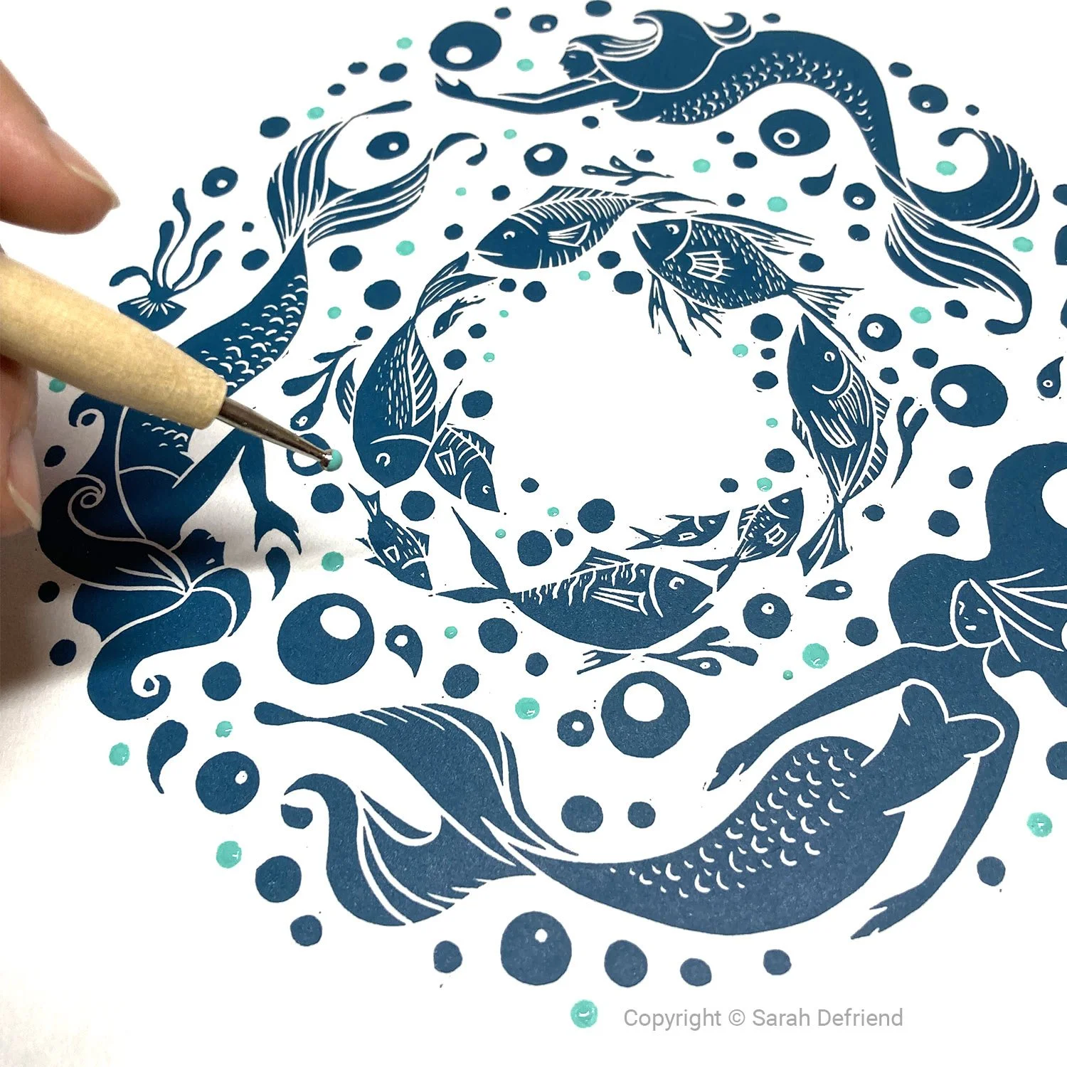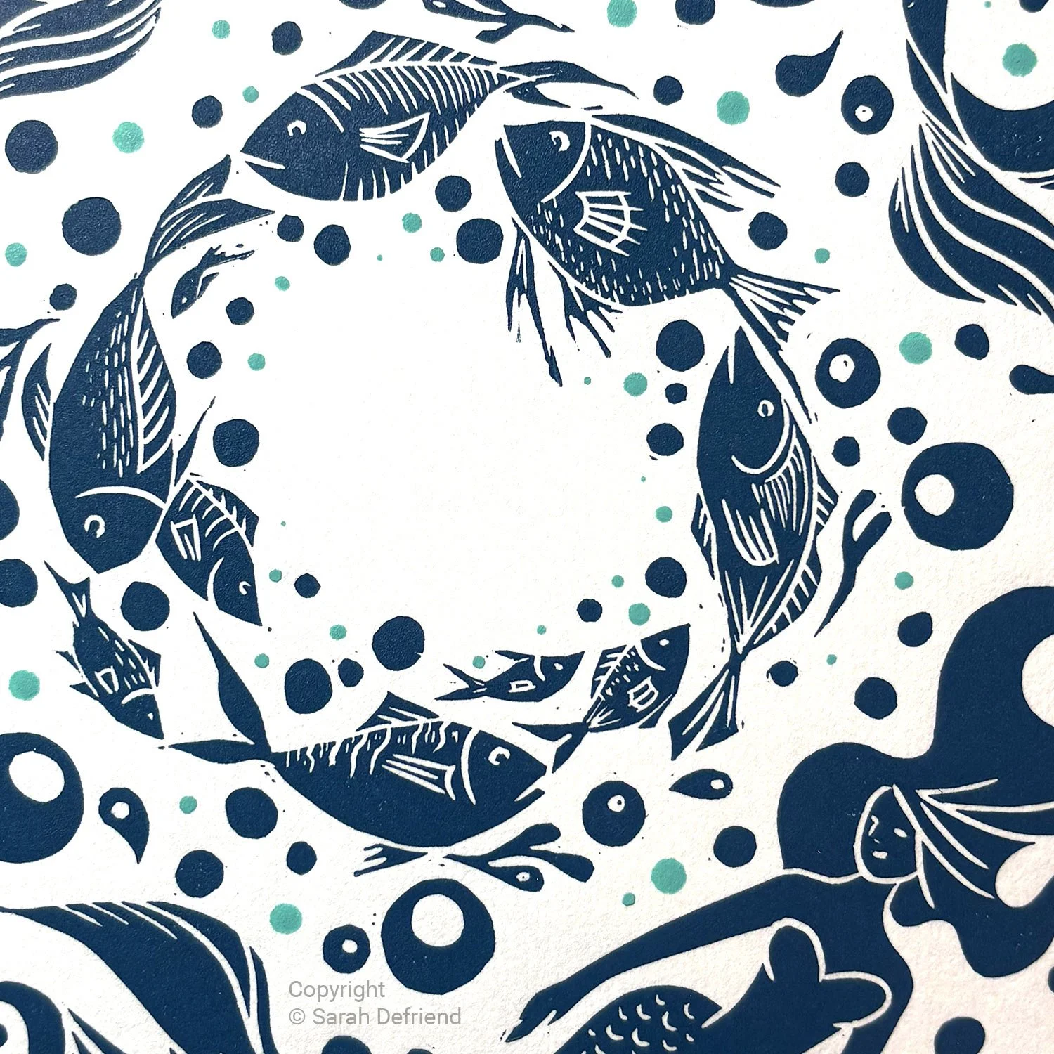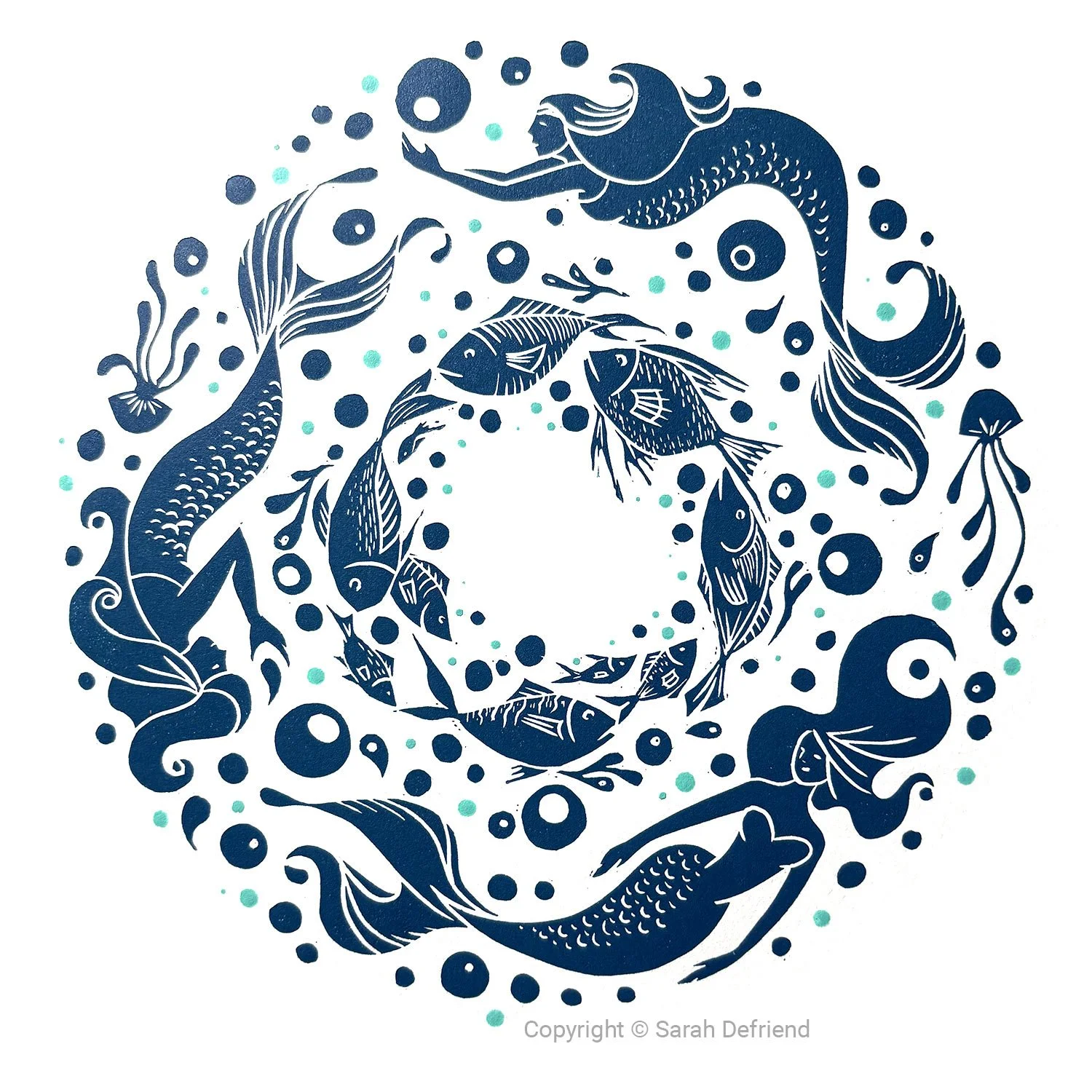 Inspired by my grandfathers tales about mermaids, I combined jellyfish and common fish from UK shores into the circular design. Each print is hand-finished with teal drops from a dotting tool.