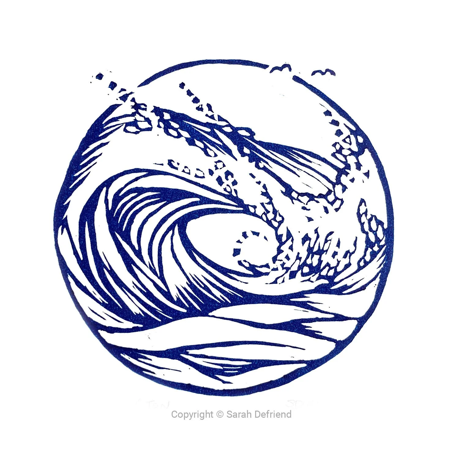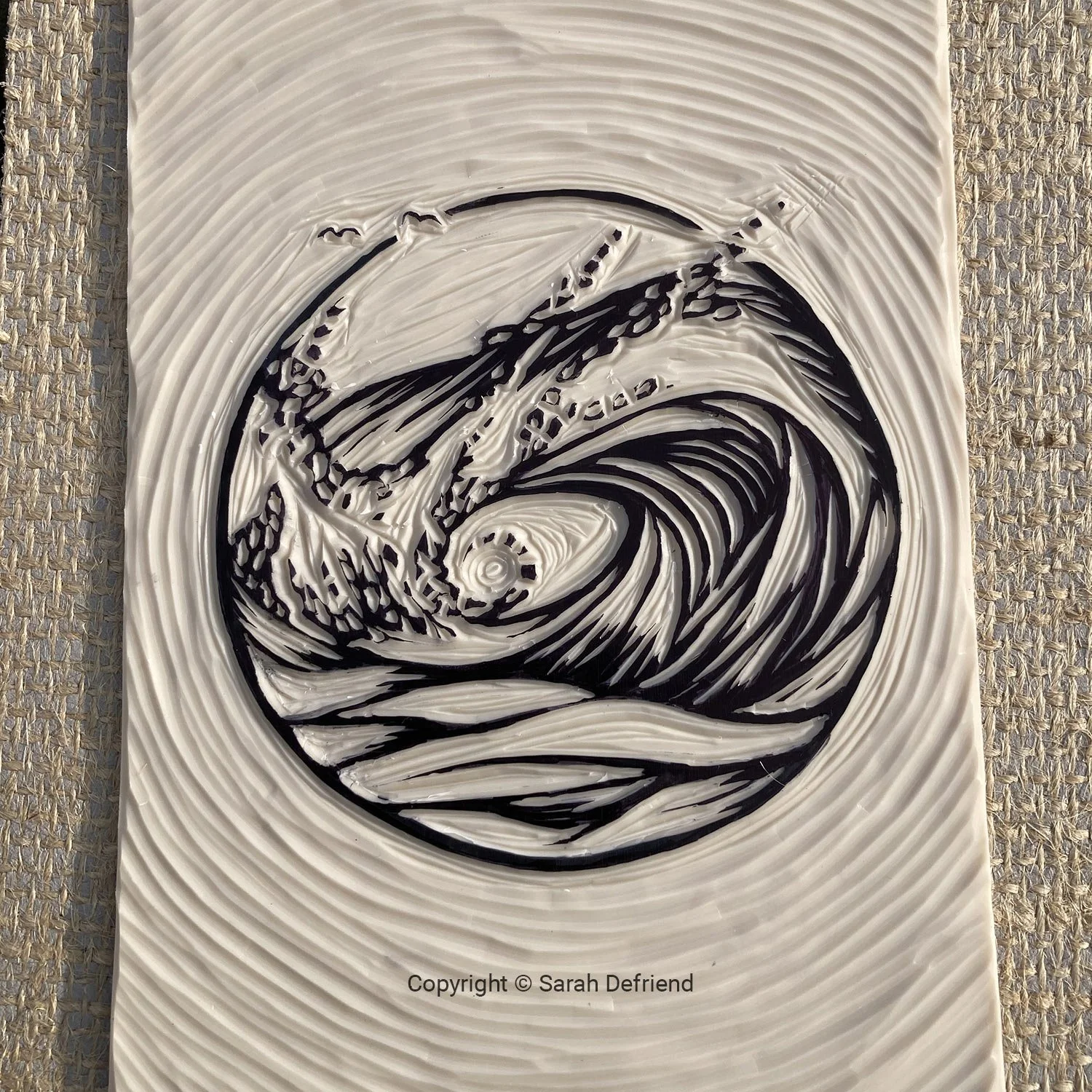 Working on a small scale, using soft-cut lino, I have carved the wave design in a circular technique with seagulls and salt spray, spilling away from the central design.