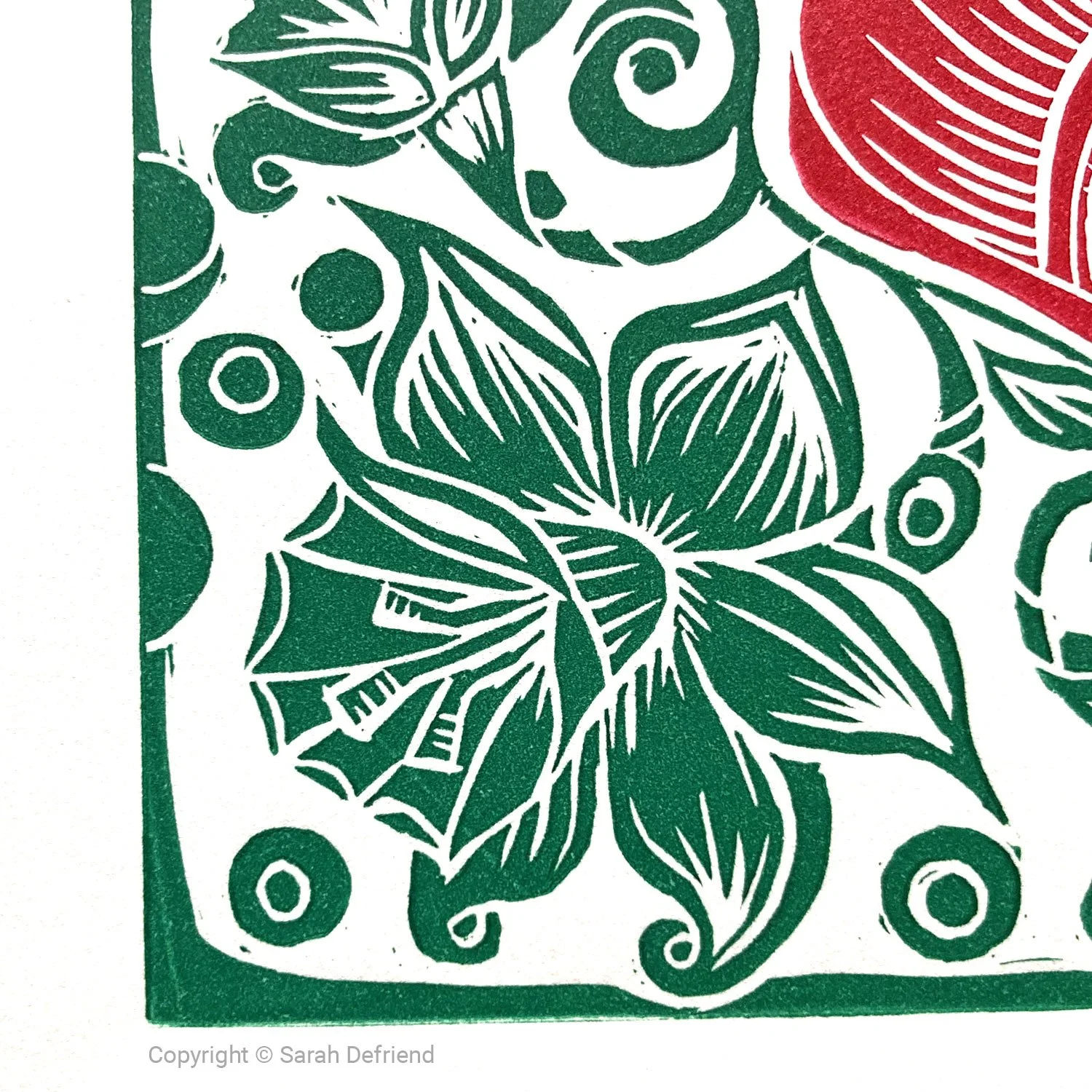 Green and Red Lino Print created for ‘Mini Print Wales’